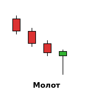A candlestick with a small body at the top and a long lower shadow (2–3 times longer than the body). Appears at the end of a downtrend and signals a potential upward reversal. The long lower shadow shows that sellers pushed the price down, but buyers managed to bring it back to the opening levels.