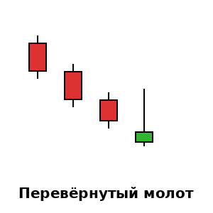 A candlestick with a small body at the bottom and a long upper shadow (2–3 times longer than the body). Appears at the end of a downtrend and signals a potential upward reversal. Buyers attempted to push the price higher, met resistance, but the very attempt indicates weakening seller pressure.