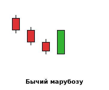 A two-candle pattern where the second candle fully “engulfs” the body of the previous one. Appears after a downtrend and signals a potential upward reversal. The first candle is red, and the second green candle opens below the first candle’s low and closes above its high — buyers have taken control from the sellers.