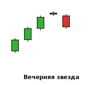 A three-candle pattern at the top of an uptrend. The first candle is a long-bodied green candle, the second is small (any color) with an upward gap (opens above the previous close), the third is a red candle closing below the midpoint of the first. Signals a downward reversal — the initiative shifts from buyers to sellers.