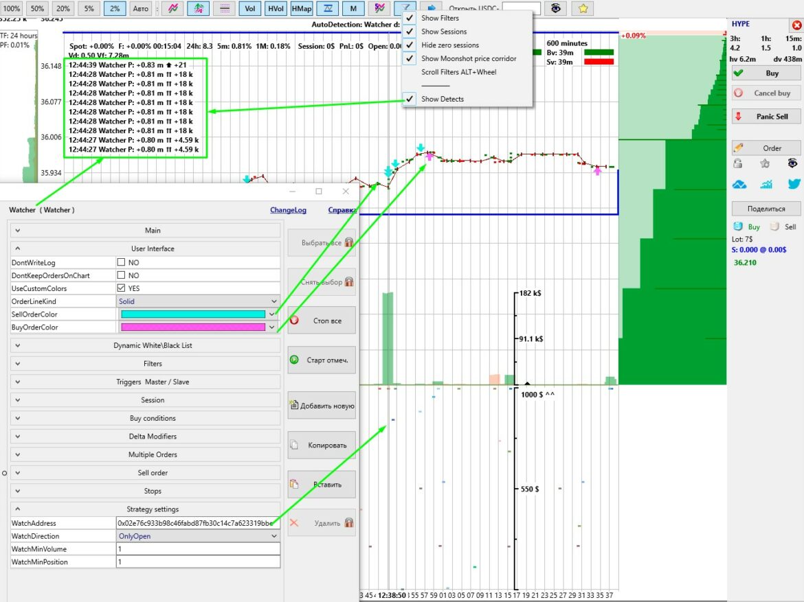 В терминале MoonBot, подключённого к споту или фьючерсам биржи Hyperliquid можно создавать специальную стратегию Watcher, которая после запуска может автоматически отслеживать указанные в ней торговые адреса, делать отметки стрелками на графике по активностям этого торгового адреса (стрелка вверх - открытие лонга или закрытие шорта, стрелка вниз - открытие шорта или закрытие лонга), цвет стрелок берется из настроек соответствующей стратегии Watcher на её вкладке User Interface из параметров SellOrderColor и BuyOrderColor. Обратите внимание, что по умолчанию стратегия Watcher создается с отключённой галочкой IndependentSignals=NO на вкладке Main, поэтому будет срабатывать верхняя активная стратегия Watcher. Если Вам нужно, чтобы работало одновременно несколько стратегий Watcher, то в каждой их них следует установить галочку IndependentSignals=NO на вкладке Main.