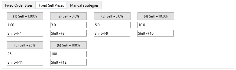 На вкладке Fixed Sell Prices задаются настройки для каждой из фиксированных кнопок Sell ордера: уровень Sell Price (тейка) Sell ордера и горячая комбинация для выбора нужной фиксированной Sell кнопки.