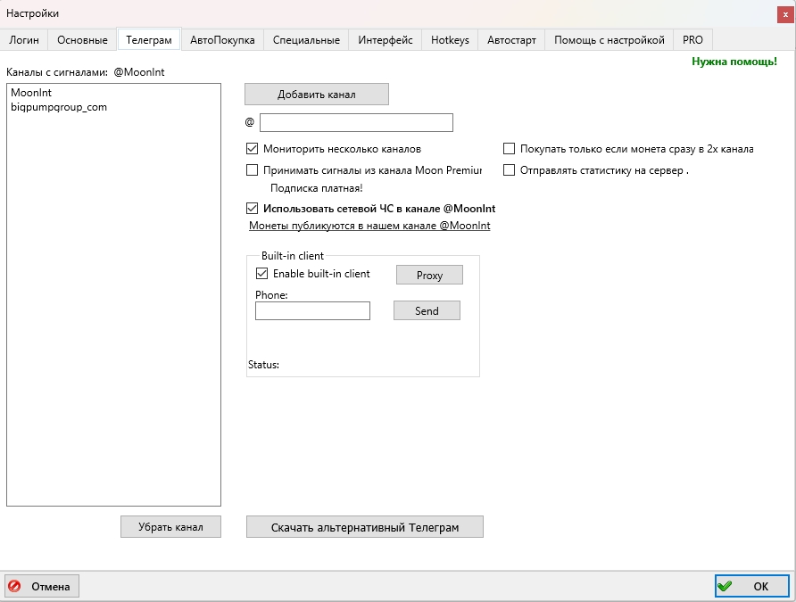Если установлена галочка Принимать сигналы из канала Moon Premium, то появится возможность принимать по платной подписке сигналы из официального Moonbot Телеграм канала (агрегатора) Moon Premium, в который поступают сигналы из различных платных источников.