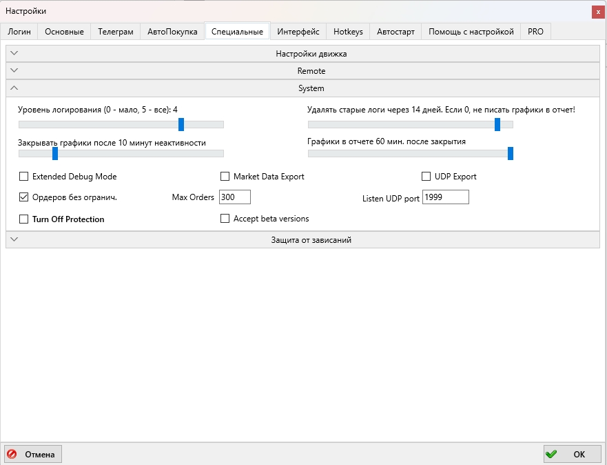 Ползунок Удалять старые логи через N дней. Если 0, не писать графики в отчет! позволяет выбрать значение дней, через которое будут удалены старые логи. Диапазон регулировки от 0 до 14 дней. По умолчанию полозок выставлен на 7 дней. Если его установить в крайнее левое положение на значение 0, то графики сделок не будут записываться. Если его установить в крайнее правое положение на значение Удалять старые логи: НИКОГДА, то логи не будут удаляться и в этом случае нужно будет самостоятельно контролировать заполнение дискового пространства.